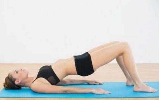 保持平卧姿势,两腿弯曲至直角状,通过脚部及肩部力量抬升臀部,两腿膝盖合拢,两脚分离,收缩臀肌1min~2min即可,继续重复2到3次。