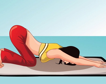 动作步骤:跪坐好臀部放在足跟上,额头贴地,手臂前伸,吸气的时候抬起头,同时胸部、下颏、手臂向前伸展,直到大腿垂直于地面保持姿势5秒钟后吸气。提起小腿,足跟向臀部收紧,收紧会阴处保持10秒,再呼气,落下小腿,放松阴部,扩张肛门。